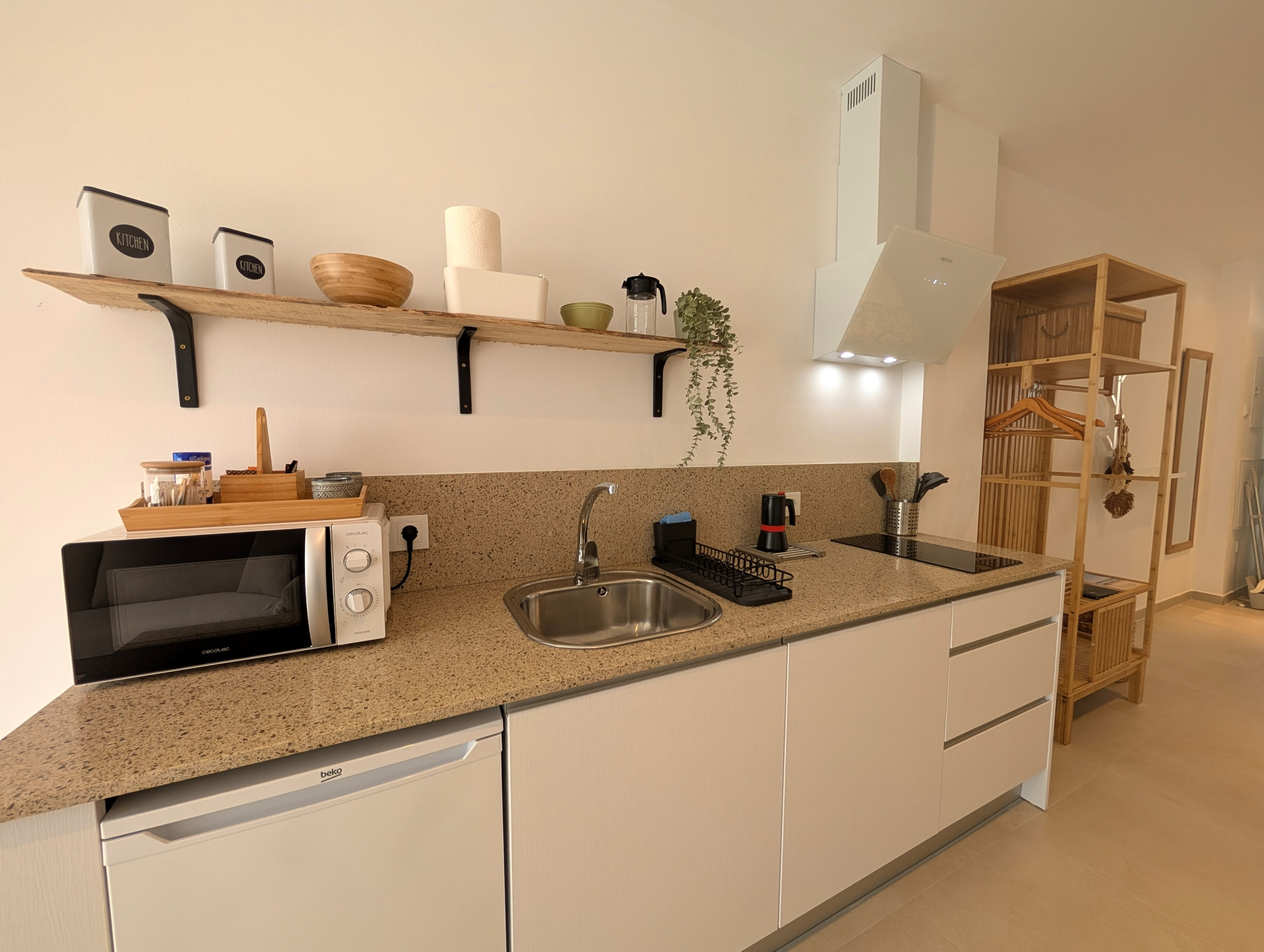 La cocina americana, de inducción, está equipada con nevera, microondas, vajilla/cubertería, utensilios/cocina, cafetera, tostadora, hervidor de agua y exprimidor.