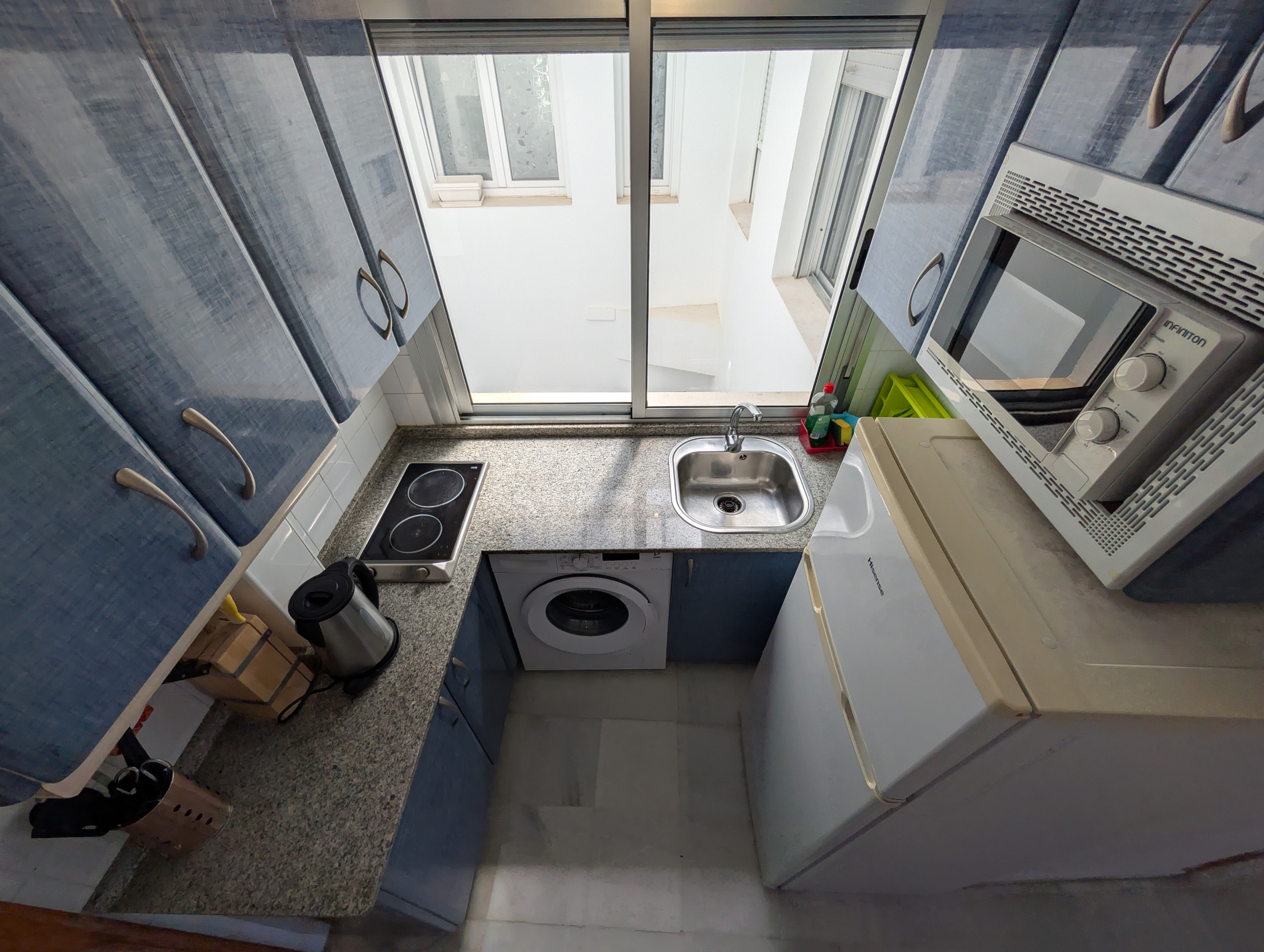 Die Küche ist komplett ausgestattet mit Kühlschrank, Mikrowelle, Kaffeemaschine, Toaster, Wasserkocher, Geschirr und Küchenutensilien.