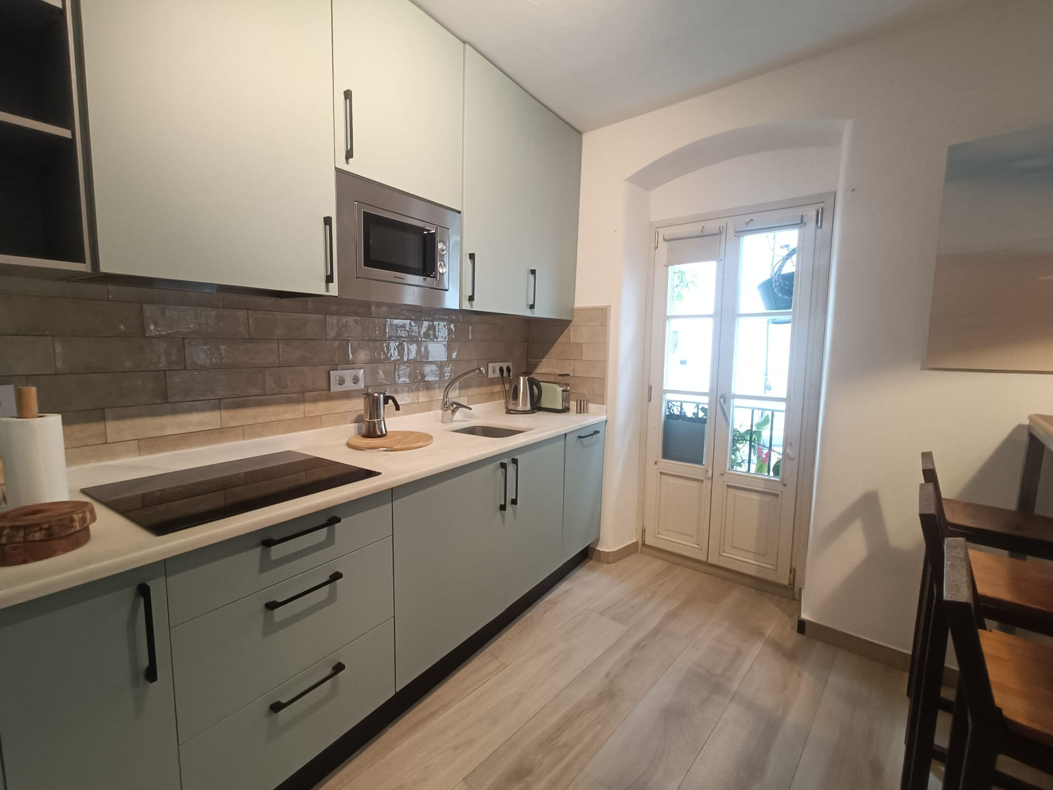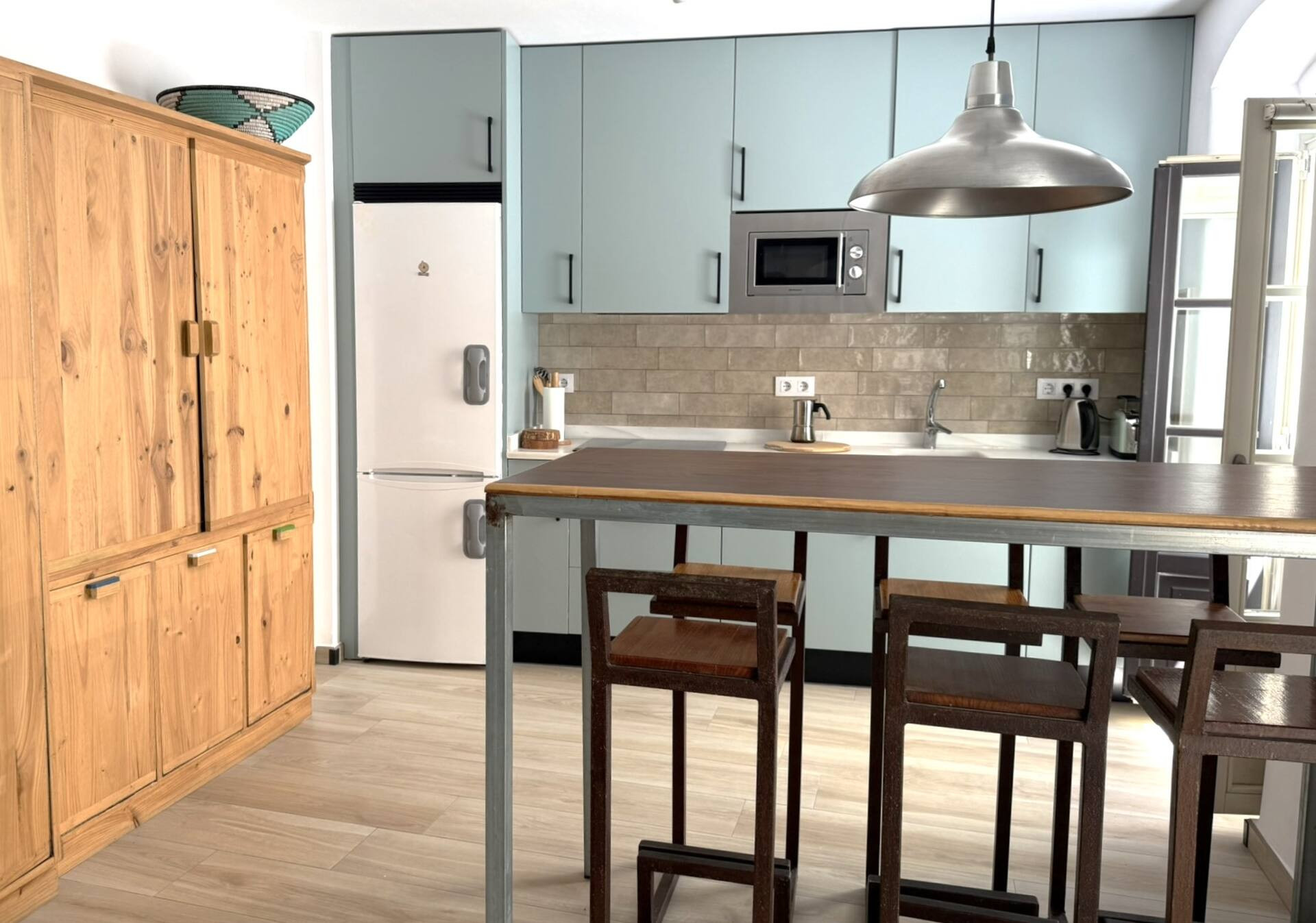 Die Wohnung ist vollständig mit Klimaanlage ausgestattet, um Ihren Komfort an heißen Tagen zu gewährleisten. Die offene Küche ist komplett ausgestattet mit Elektrogeräten wie Kühlschrank, Waschmaschine, Mikrowelle, Kaffeemaschine, Toaster, Wasserkocher und Entsafter, was die Zubereitung von Speisen und Getränken erleichtert.